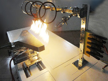 ◆  Water spray: A spray noozle (see pic-4) is installed on the test support (see pic 2, 3), just middle of the burner. Water pressures: 250KPa~350KPa. Spray water 0.25L/m2~0.30L/m2around sample. This spraying rate needs to use collection tray to measure. This tray has enough depth, to let its long axis parallel to the axis of the cable and in the middle place. It’s about 100mm in width, 400 in length.
